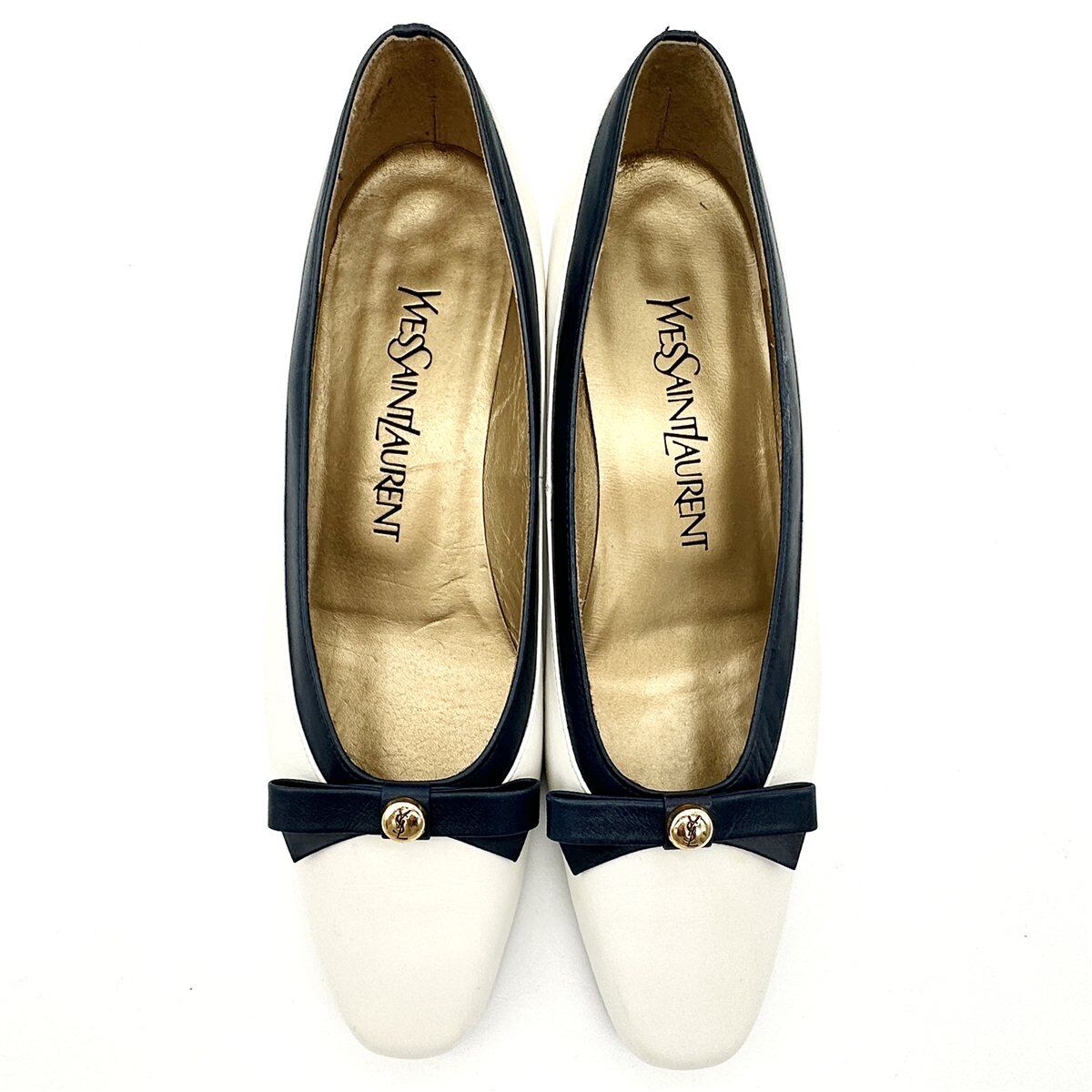■新品級■ YVES SAINT LAURENT パンプス 本革 バイカラー リボン ゴールドロゴ ホワイト 2215T