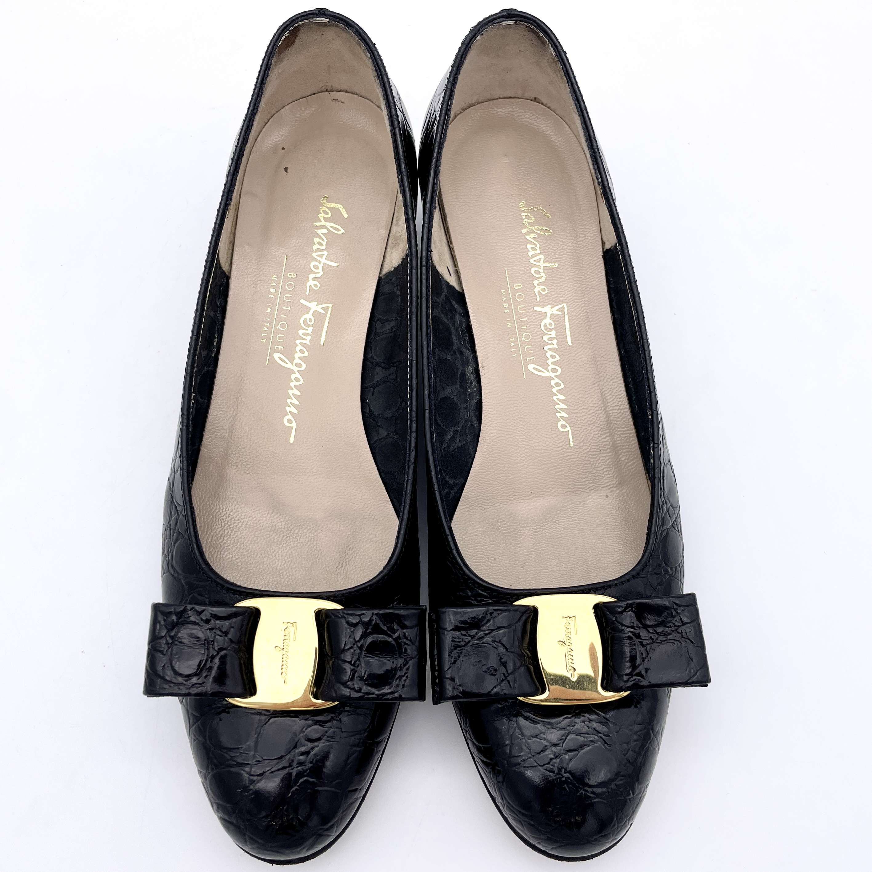 Ferragamo パンプス 本革 ヴァラリボン クロコ ブラック 1261A